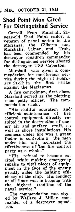 Carroll Penn Marshall, 21-year-old Shad Point sailor, a veteran of naval action in the Marianas, the Gilberts and Marshalls, Saipan, and Truk, has been commended by his destroyer squadron commander for distinguished service aboard the destroyer USS Caperton.