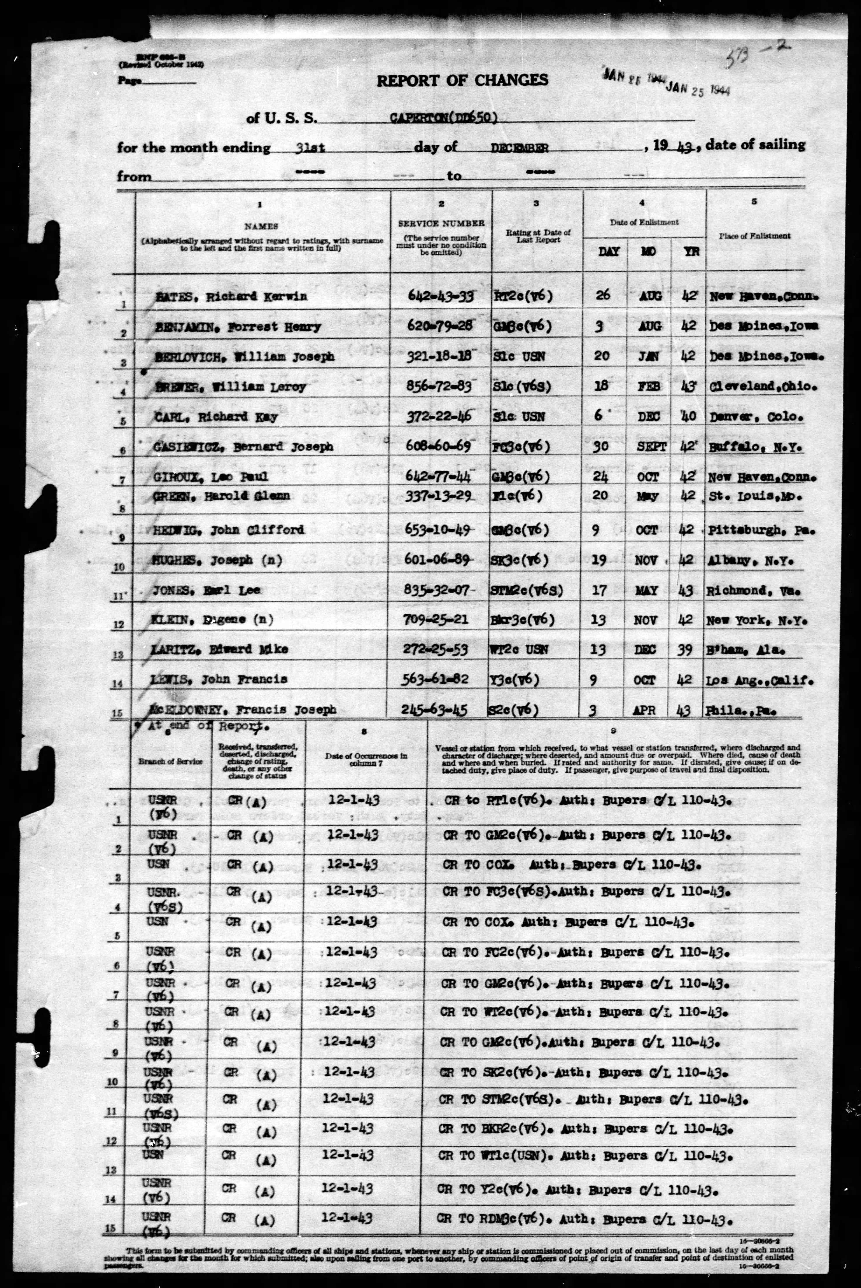 Forrest H. Benjamin, SN 620-79-28 enlisted in the US Navy on 08-03-1942 at Des Moines, IA. .To see the date Mr. Benjamin then joined the USS CAPERTON look at the first line of the table below that starts with ROC. ROC is short for Report of Change. The Muster Rolls used to obtain this information recorded all transitional activity including being received onto the Caperton, Leaving the Caperton. Promotions, demotions. Each Change is recorded as an ROC with some details and the Rating of the sailor included. Clicking on the blue ROC Page button to the right of the line will bring up a copy of the actual ROC Page so that you can download it if you wish.The MROTC is a quarterly report of all sailors reported on the ship. As such the Status Change and Change columns would be blank. TRAN. is for Transferred OFF the USS Caperton while REC is Received ON TO the USS Caperton.