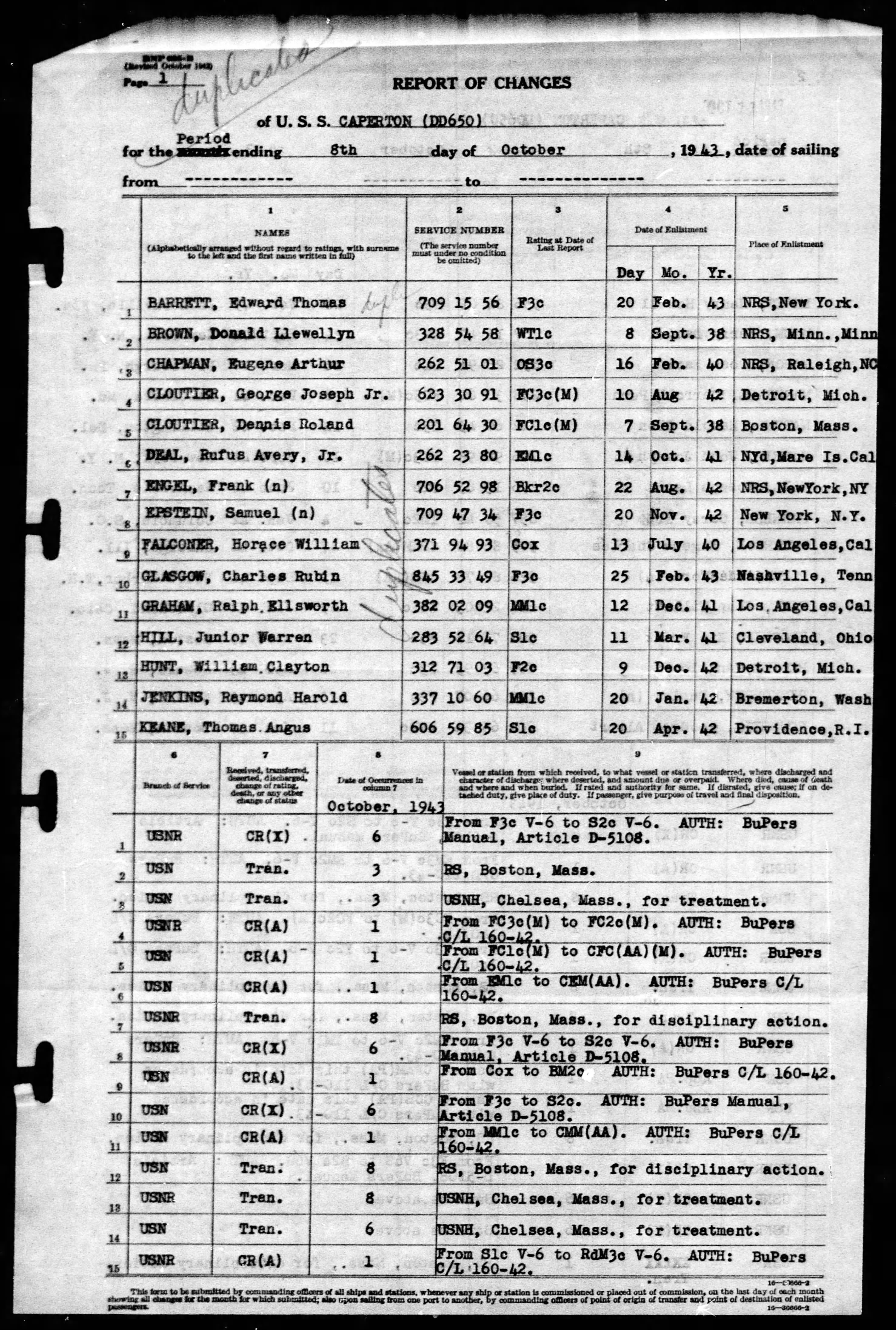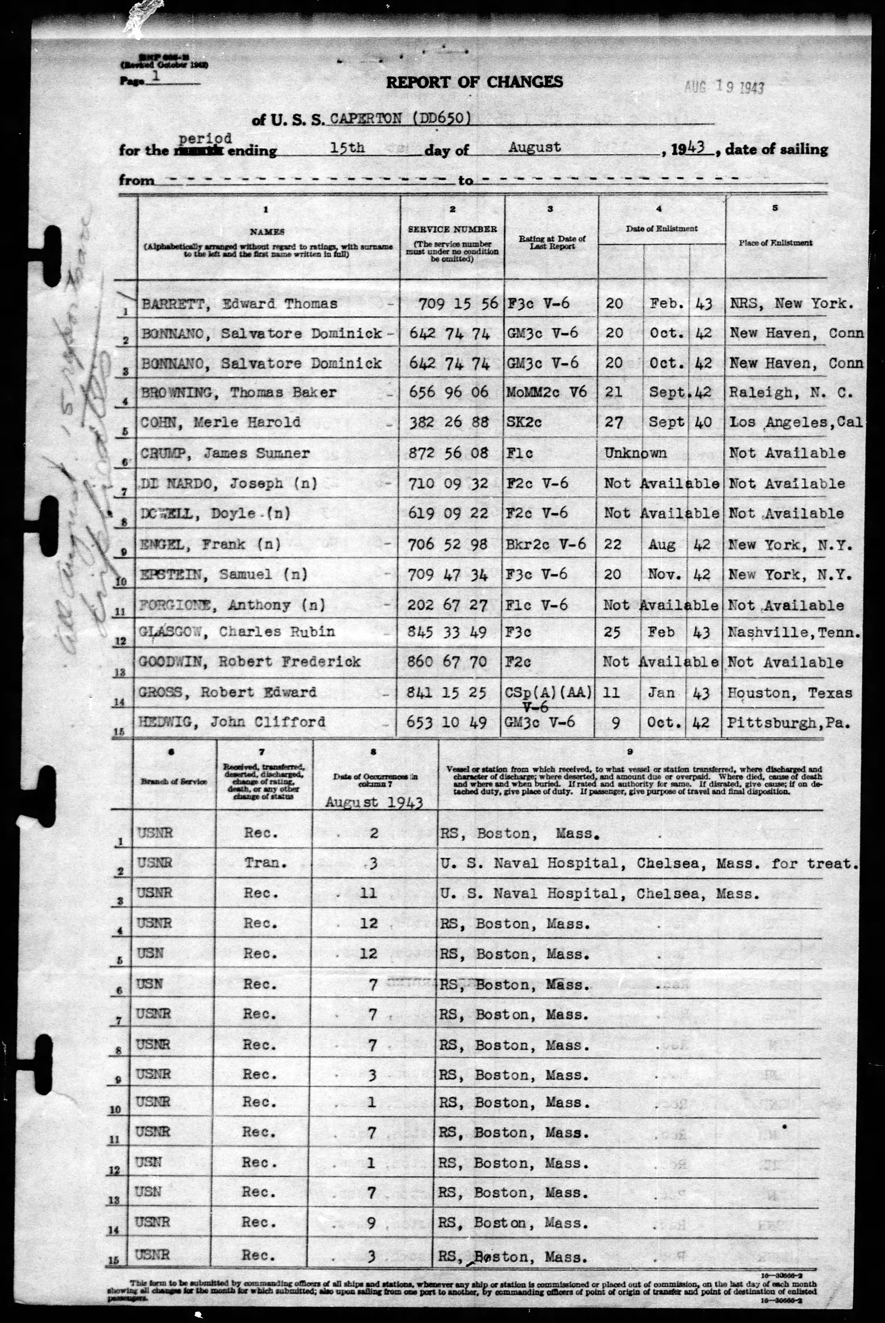 Edward T. Barrett, SN 709-15-56 enlisted in the US Navy on 02-20-1943 at NRS, New York, NY. .To see the date Mr. Barrett then joined the USS CAPERTON look at the first line of the table below that starts with ROC. ROC is short for Report of Change. The Muster Rolls used to obtain this information recorded all transitional activity including being received onto the Caperton, Leaving the Caperton. Promotions, demotions. Each Change is recorded as an ROC with some details and the Rating of the sailor included. Clicking on the blue ROC Page button to the right of the line will bring up a copy of the actual ROC Page so that you can download it if you wish.The MROTC is a quarterly report of all sailors reported on the ship. As such the Status Change and Change columns would be blank. TRAN. is for Transferred OFF the USS Caperton while REC is Received ON TO the USS Caperton.